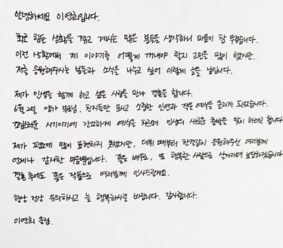 <다음은 이연희 팬카페 결혼 발표 글 전문>
