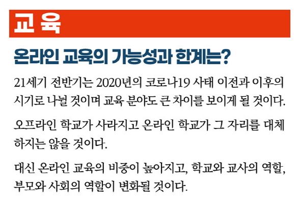 21세기 전반기는 2020년의 코로나19 사태 이전과 이후의 시기로 나뉠 것이며 교육 분야도 큰 차이를 보이게 될 것이다. 오프라인 학교가 사라지고 온라인 학교가 그 자리를 대체하지는 않을 것이다. 대신 온라인 교육의 비중이 높아지고, 학교와 교사의 역할, 부모와 사회의 역할이 변화될 것이다.
