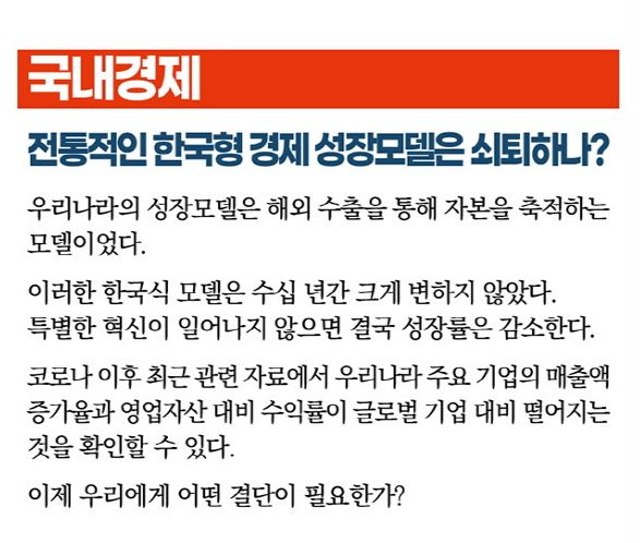 우리나라의 성장모델은 해외 수출을 통해 자본을 축적하는 모델이었다. 이러한 한국식 모델은 정립된 후 수십 년간 크게 변하지 않았다. 그러나 특별한 혁신이 일어나지 않으면 결국 성장률은 감소한다. 코로나 이후 최근 관련 자료에서 우리나라 주요 기업의 매출액 증가율과 영업자산 대비 수익률이 글로벌 기업 대비 떨어지는 것을 확인할 수 있다.