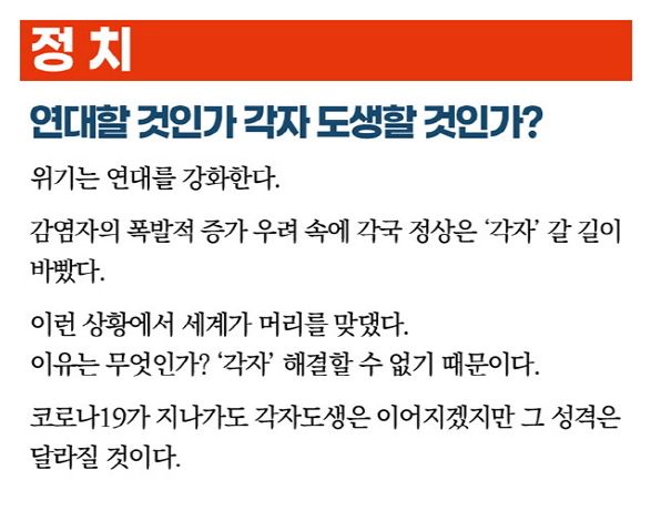 위기는 연대를 강화한다. 감염자의 폭발적 증가 우려 속에 각국 정상은 ‘각자’ 갈 길이 바빴다. 이런 상황에서 세계가 머리를 맞댔다. 이유는 무엇인가? ‘각자’ 해결할 수 없기 때문이다. 코로나19가 지나가도 각자도생은 이어지겠지만 그 성격은 달라질 것이다.