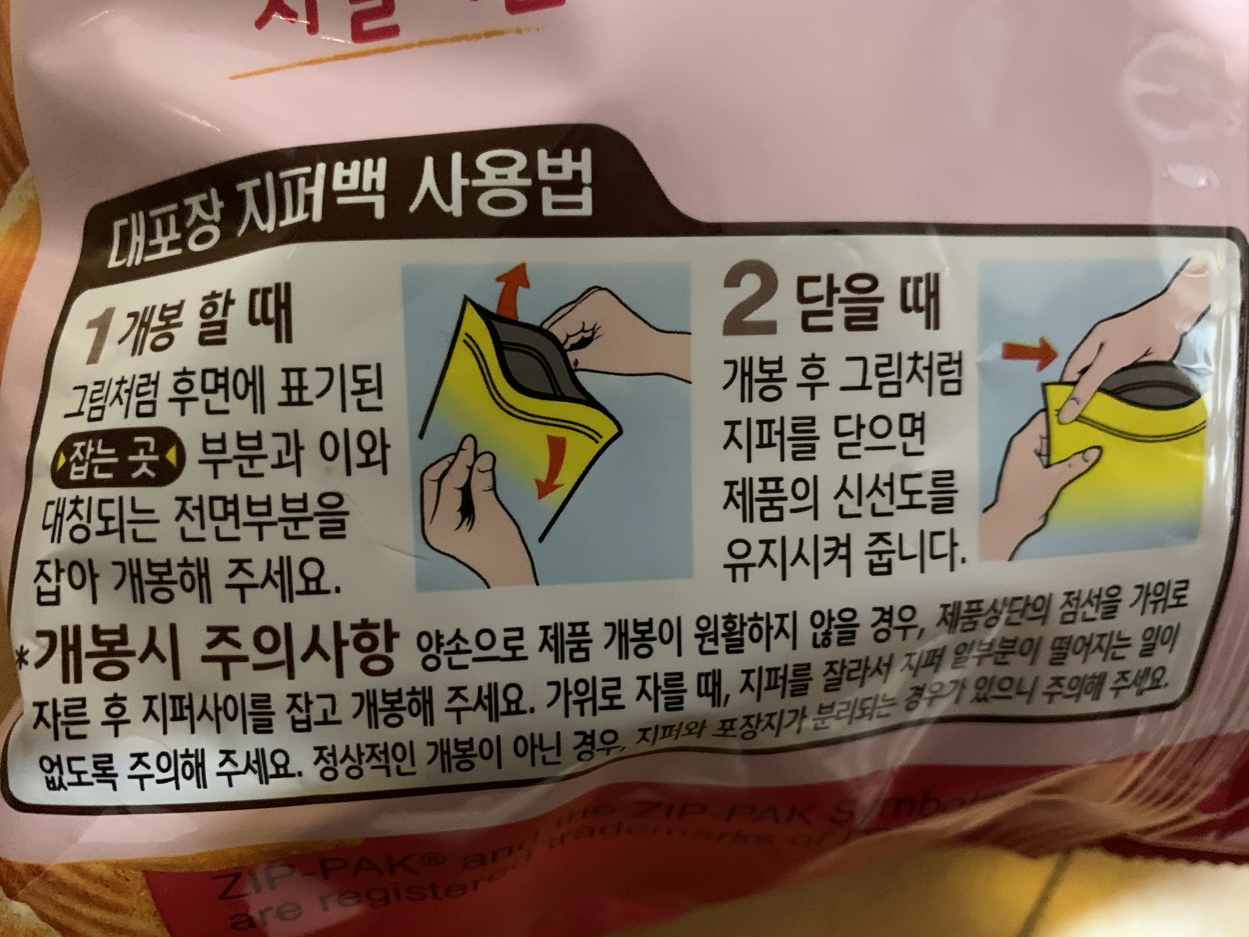 지퍼로 잠굴 수 있게 되어 있어서 한두개만 집어 먹다가 다시 밀봉상태로 보관할 수 있다는 장점이 나에게는 정말 중요한 기능으로 느껴진다. 누가 생각해낸건지 모르겠으나, 경제적이면서도 효율적인 포장법이다. 작은 봉지 여러개를 만들어서 판매 하는 것보다 이렇게 큰 봉지 하나에 다 담아서 한 봉지를 여러번 열어서 먹을 수 있게 해주었으니, 이런 아이디어를 냈을 과자회사의 누군가에게 감사함을 표한다.