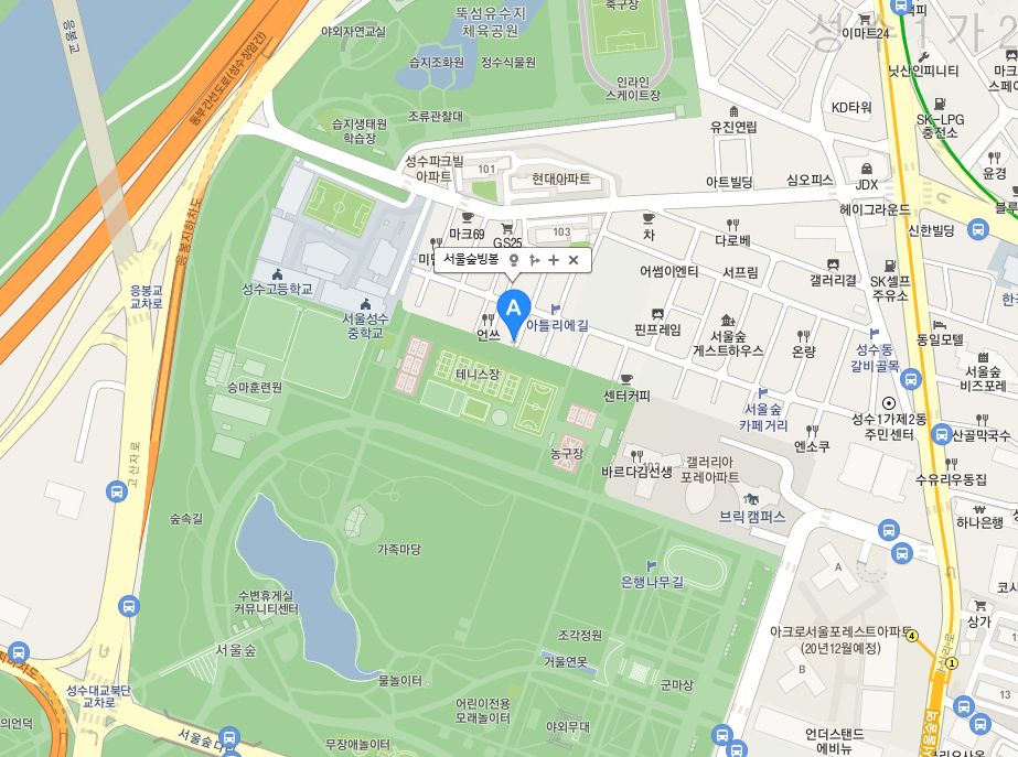 간단히 설명을 하자면, 서울숲 공영주차장으로 가서 차를 주차하고 걸어서 15분 정도 거리입니다. 걷는 것도 일반 길을 걷는게 아니라 서울숲 내부 산책로를 따라서 걸어가는 거라서 산책한다 생각하고 아이들과 함께 걸어가기 좋았던 곳입니다. 아이들이 있으신 분들은 씽씽이를 대동해서 간다면 편하게 이동하실 수 있습니다.
