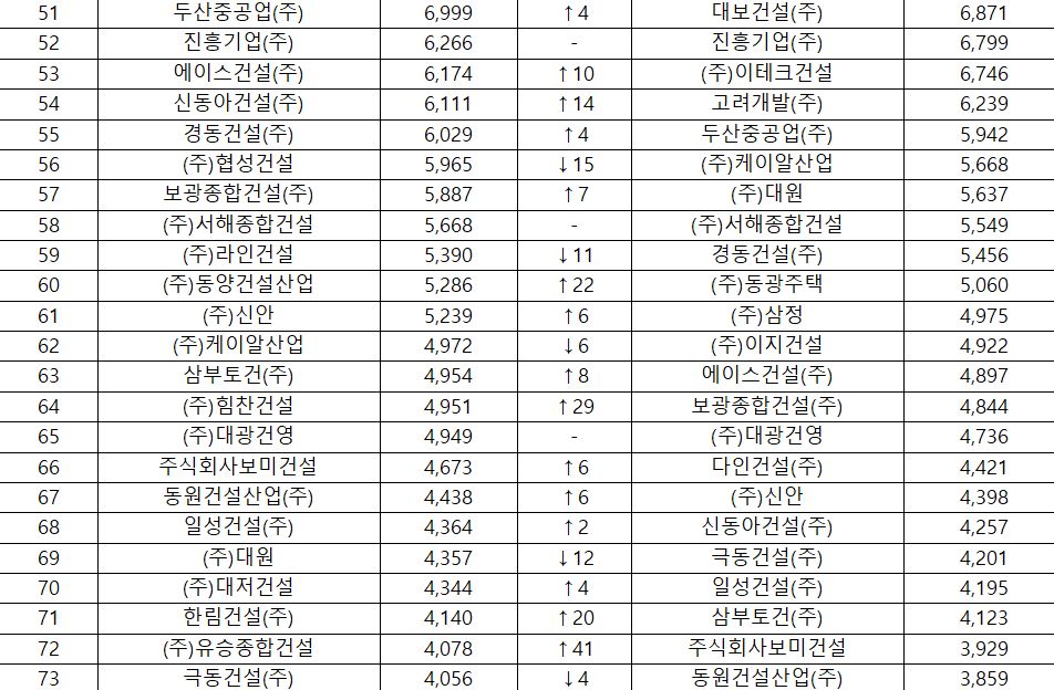 7위 현대엔지니어링㈜(7조 6,770억 원), 8위 롯데건설㈜(6조 5,158억 원), 및 9위 에이치디씨현대산업개발㈜(6조 1,593억 원)은 전년도와 동일한 순위를 유지했으며, 지난해 11위로 물러났던 에스케이건설㈜(5조 1,806억 원)은 10위권 내에 재진입하였다.