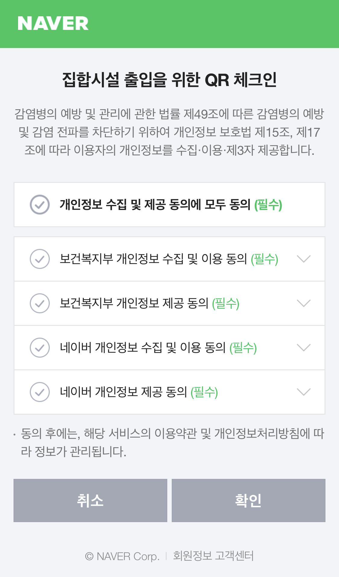 ▼ 네이버와 같이 QR체크인을 위해 모든 사항에 동의합니다.