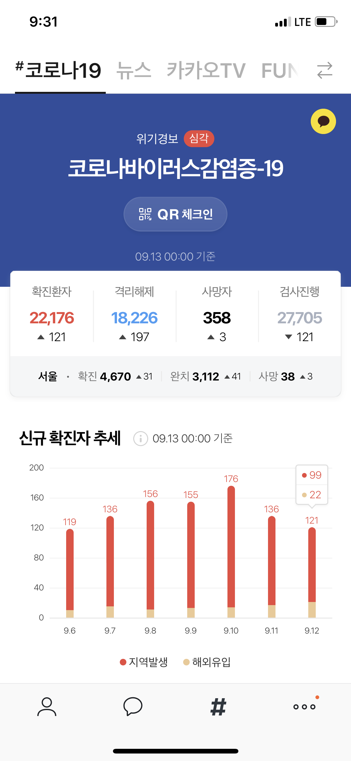 ▼ #버튼을 누르면 아래와 같이 각종 뉴스와 카카오TV등으로 연결이 되는데요 저중에서 가장 앞에 있는 '코로나19'를 클릭합니다. 그리고 상단의 'QR체크인'을 클릭합니다.