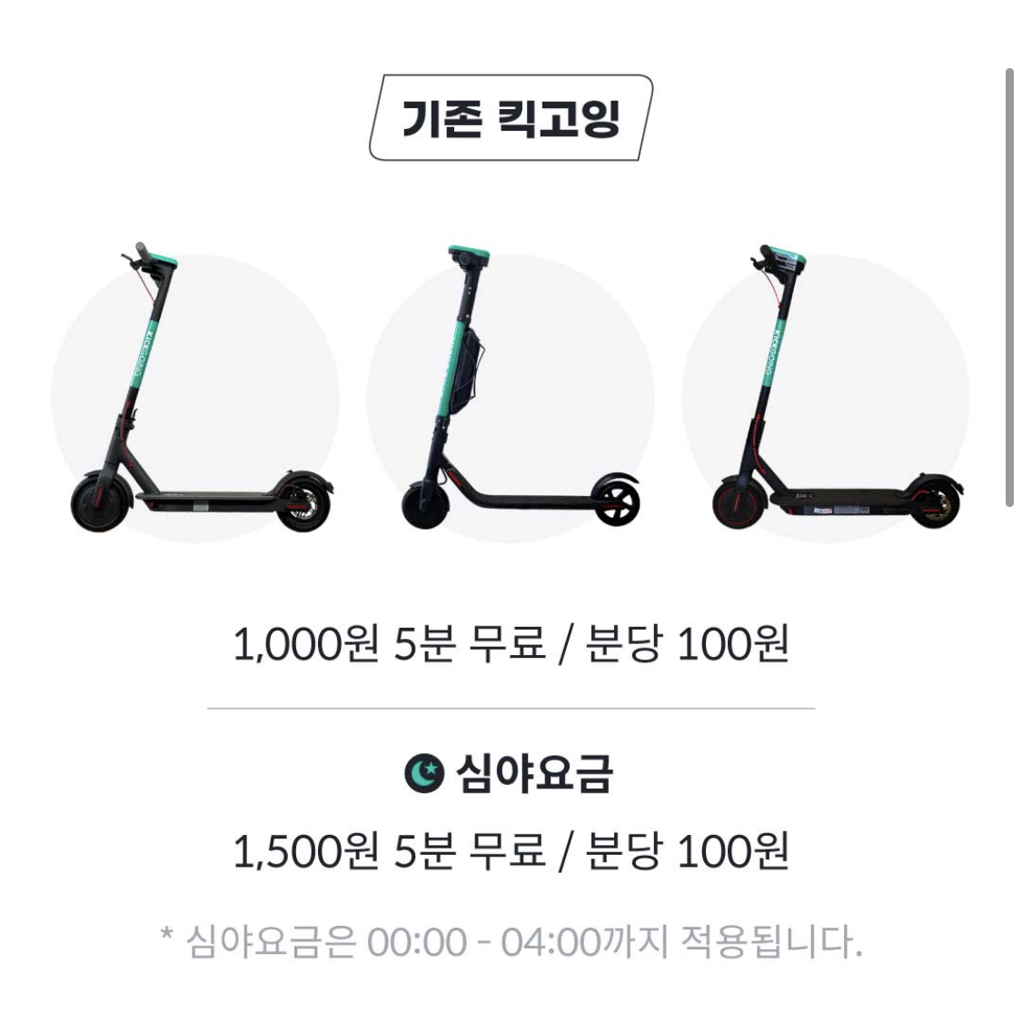 킥고잉의 킥보드는 기존 킥고잉 모델이 있고 신형 모델이 있습니다. 기존의 경우 1000원을 내면 5분동안 사용이 가능하고 5분이 경과하면 분당 100원이 추가됩니다.