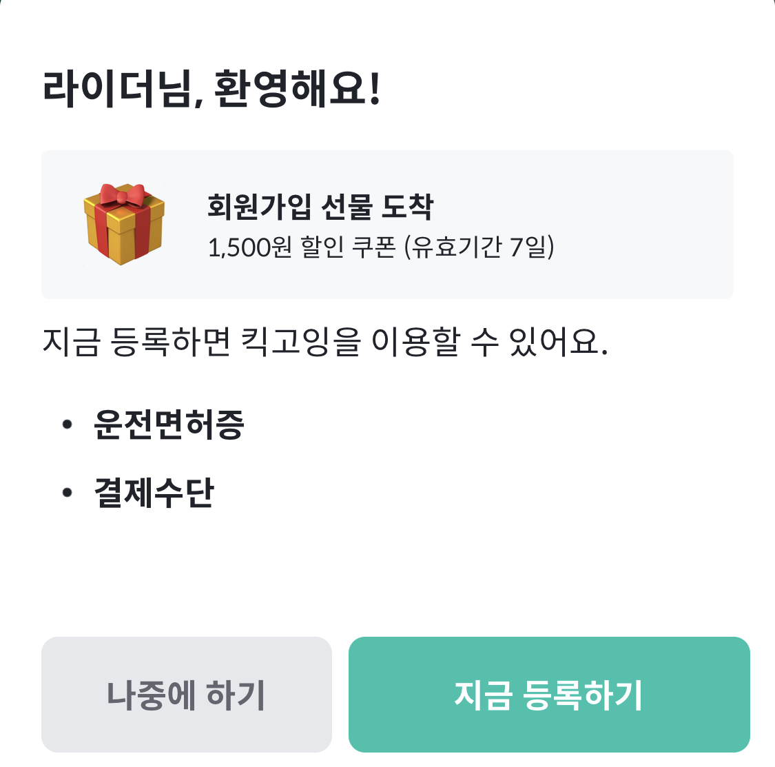 ▼ 그리고나면 두가지를 진행해야만 앱을 사용할 수 있는데요, 하나는 운전면허증 등록이고 다른 하나는 결제수단 등록입니다.
