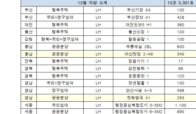 ○ 아산탕정(12월, 340호), 창원명곡(12월, 263호) 등 2곳 603호의 분양형 신혼희망타운과 후분양 단지인 계룡대실2(12월, 600호)를 비롯하여 행정중심복합도시 6-3M2(12월, 995호) 등이 있다.