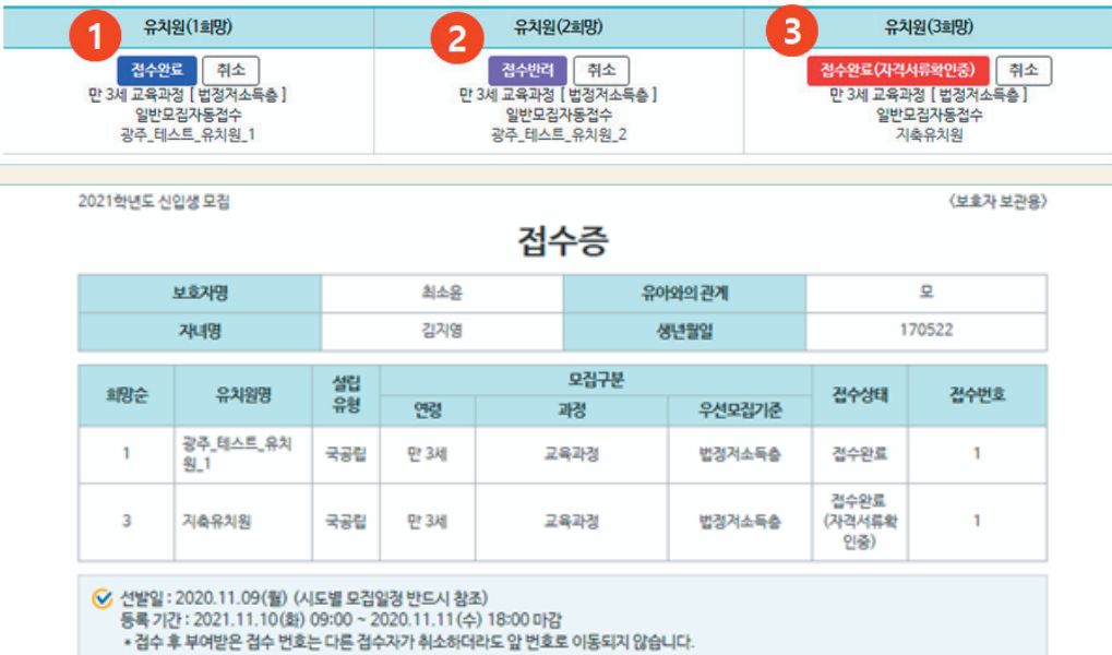 ▼ 이렇게 하여 유치원 등록이 완료됩니다. 접수완료가 파란색으로 떠야만 완료이며, 보라색이나 빨간색의 경우는 조건이 해당이 안되거나 또는 추가로 제출해야 하는 서류가 있다는 뜻입니다.