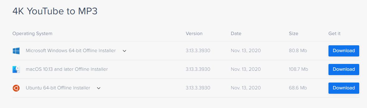 Download rescent versions of 4K Video Downloader, 4K Video to MP3, 4K YouTube to MP3, 4K Stogram and 4K Slideshow Maker