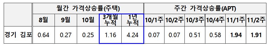 * 김포시 중 최근 시세기준 안정세를 보이는 통진읍 및 월곶‧하성‧대곶면 제외