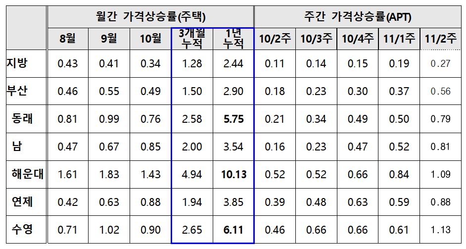 - 부산은 조정대상지역 해제* 이후 안정세를 유지하였으나, 금년 7월부터 상승폭 확대 중이며, 최근 외지인 매수세가 증가하여 과열 심화가 지속될 것으로 우려됩니다.