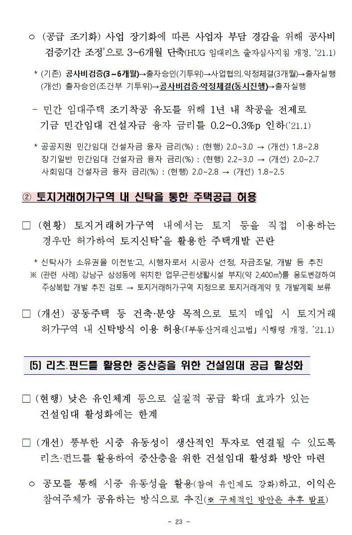 ㅇ 민간의 공급확대를 위해 도심 내 공급하는 공공지원민간임대에 대한 기금융자 한도 및 금리 인하 추진, 리츠․펀드 등을 활용한 건설임대 활성화 방안도 마련하겠습니다.
