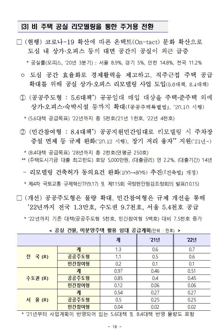 ㅇ `21년 하반기에는 공실 상가․오피스․숙박시설 리모델링을 통한 주거공간을 공급하기 시작하는 등 2.6만호(수도권 1.9만호)의 주택이 공급됩니다.