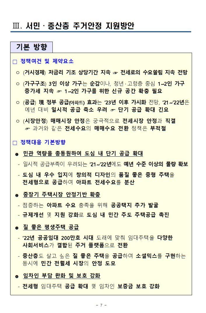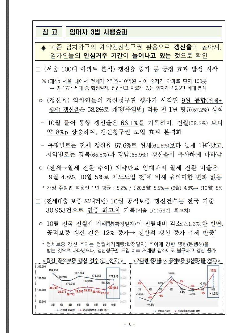 ㅇ 아울러, 실수요 중심의 시장 조성, 임차인 주거안정 강화를 위한 확고한 의지를 가지고 매매시장 안정화, 임대차 3법 조기정착 등 국민 여러분께 약속드린 정책을 흔들림 없이 추진해 나가겠습니다.