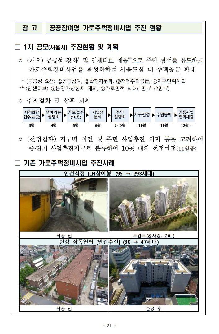 ㅇ 사업승인을 받은 LH의 미착공 물량 순차 착공, 공공참여형 가로 주택정비사업 전국 확대, 택지추가 확보 등을 추진하겠습니다.