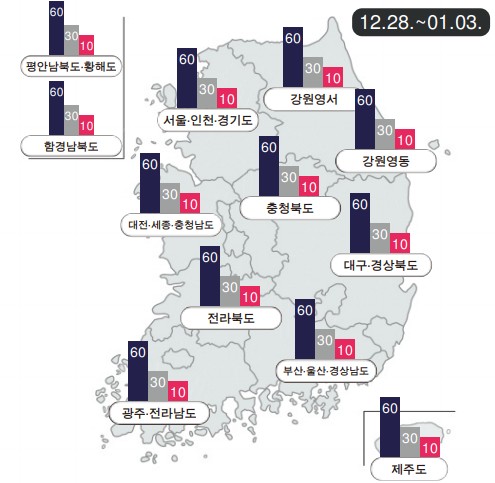 대륙고기압의 영향을 주로 받아 추운 날이 많겠으며, 서해안과 제주도를 중심으로 다소 많은 눈이 내릴 때가 있겠습니다. (주평균기온) 평년(-1.1~0.3℃)보다 낮겠습니다. (주강수량) 평년(1.3~3.8㎜)과 비슷하거나 적겠습니다.