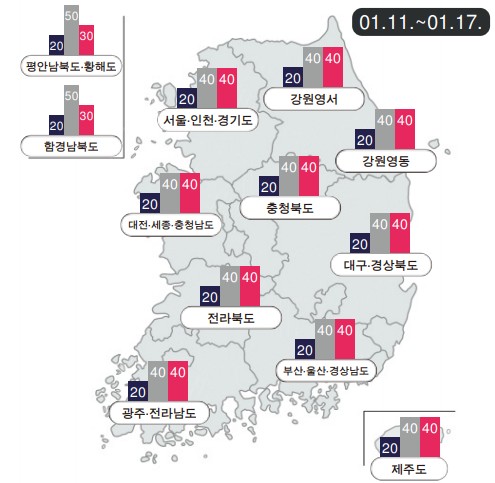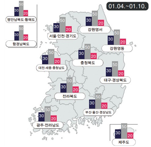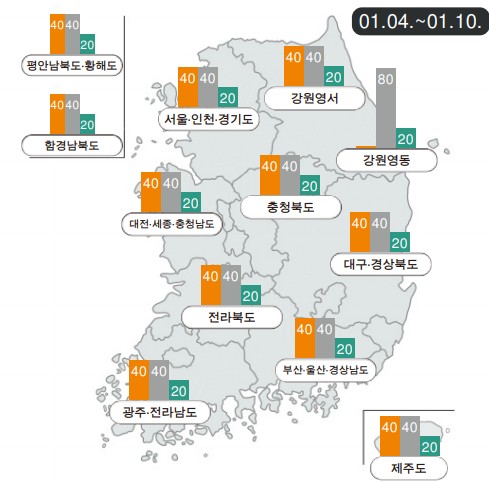 대륙고기압과 이동성 고기압의 영향으로 기온의 변동폭이 크겠습니다. (주평균기온) 평년(-2.1~-0.3℃)과 비슷하겠습니다. (주강수량) 평년(2.9~7.5㎜)과 비슷하거나 적겠습니다. |