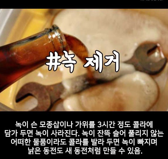 3시간 정도만 담궈두면 되며, 심지어는 자동차의 범퍼나 자전거등에서 녹이 슨 부분에서 녹을 제거할때도 콜라가 효과적입니다.