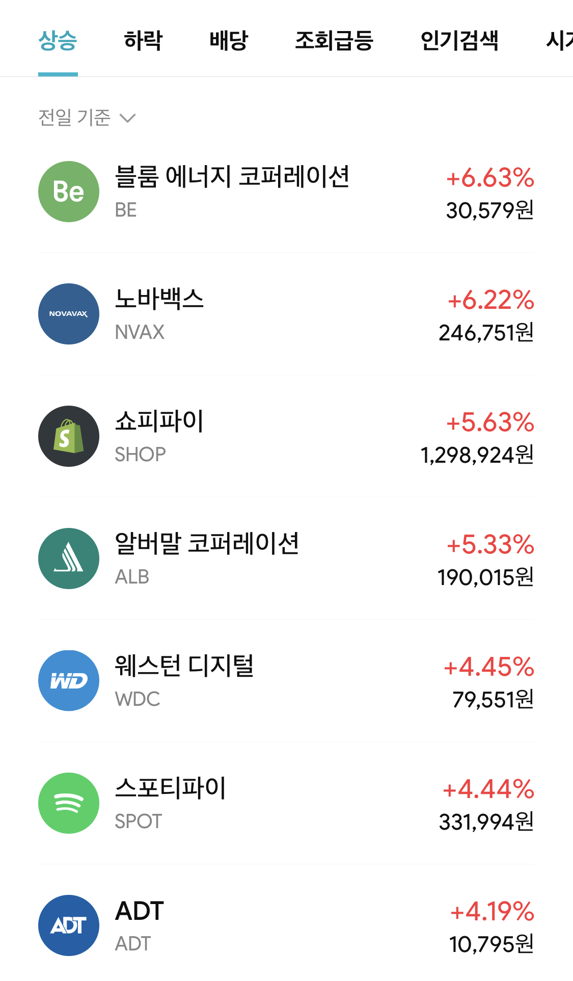 전날 기준으로 상승주와 하락주, 그리고 배당주, 조회급등주, 인기검색주 등이 순위별로 나열되어 있습니다.