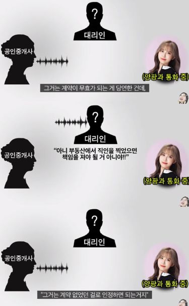 이에 양팡 측은 "부모님들이 자기 허락을 받지 않고 무권대리로 진행했다. 모든 책임은 공인중개사에 있다"고 갑자기 공인중개사를 비난하기 시작한다.