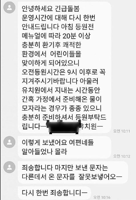 유치원 교사가 긴급보육 관련하여 학부모들에게 문자메세지를 보내다가 마음에만 있던 말을 내 뱉어버렸다.