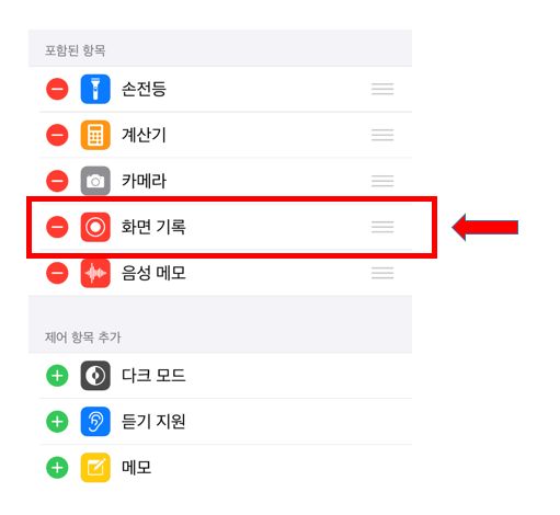 3) 여기서부터는 개인별로 차이가 있을 겁니다. '화면기록'이라는 아이콘이 포함된 항목에 없으신 분들은 '제어항목추가'를 통하여 포함을 시켜주셔야 합니다. 대부분의 경우 손전등, 계산기, 카메라는 다 되어 있지만 화면기록과 음성메모는 설정이 안되어 있는 경우가 많습니다. 이번 기회에 그냥 넣어주시면 좋겠습니다.